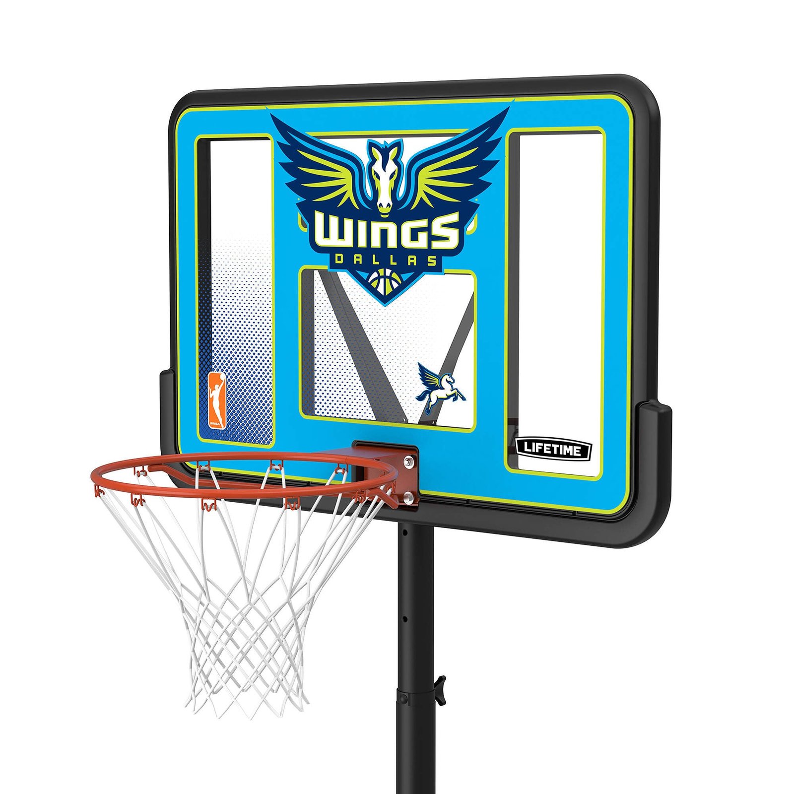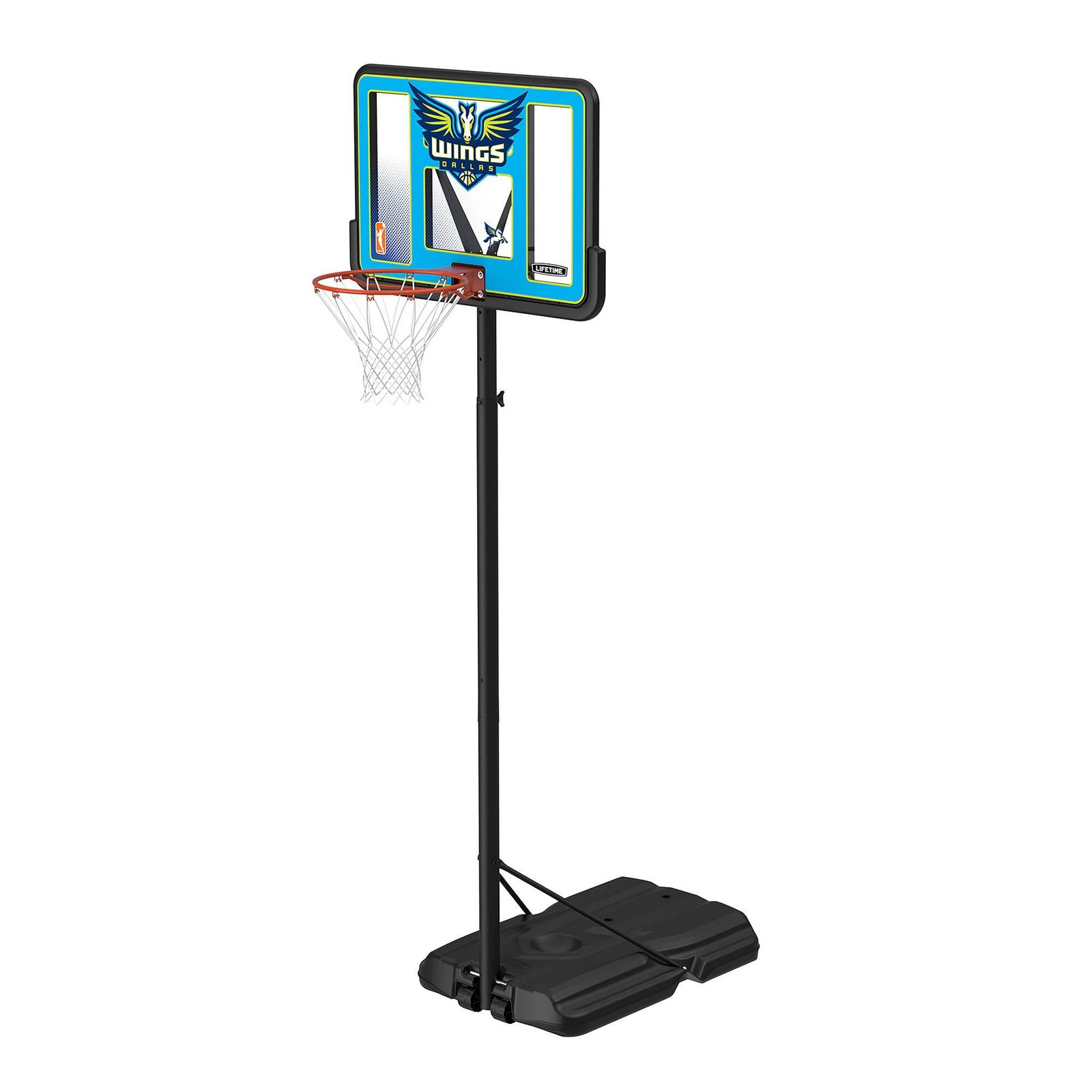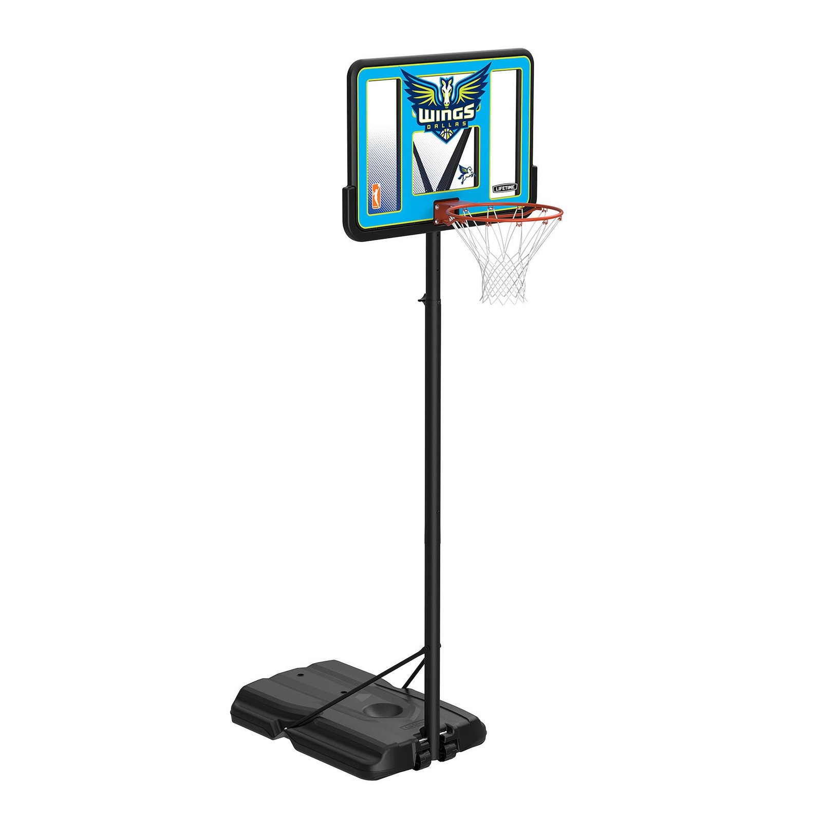 Bring the WNBA to your home with the Lifetime 44-Inch Shatterproof Fusion Portable Basketball System. For the first time ever, you can own a full-size residential hoop decorated with graphics representing your favorite WNBA team, all while trusting in the U.S.-made quality of Lifetime Products, the top name in residential basketball. Set the powder-coated steel Classic Rim to the height of your choice using the telescoping adjustment mechanism, and set up the hoop anywhere you want it using the fully portable, fully stable heavy-duty Pro Court base. A 2.75-inch round powder-coated steel pole and all-weather net ensure that your hoop stays strong through exposure to the elements. Play to your maximum potential on a 44-inch Shatterproof Fusion Backboard, the official backboard of the WNBA. Enjoy the game of basketball at home while repping your favorite WNBA team with the Lifetime 44-Inch Shatterproof Fusion Basketball System.