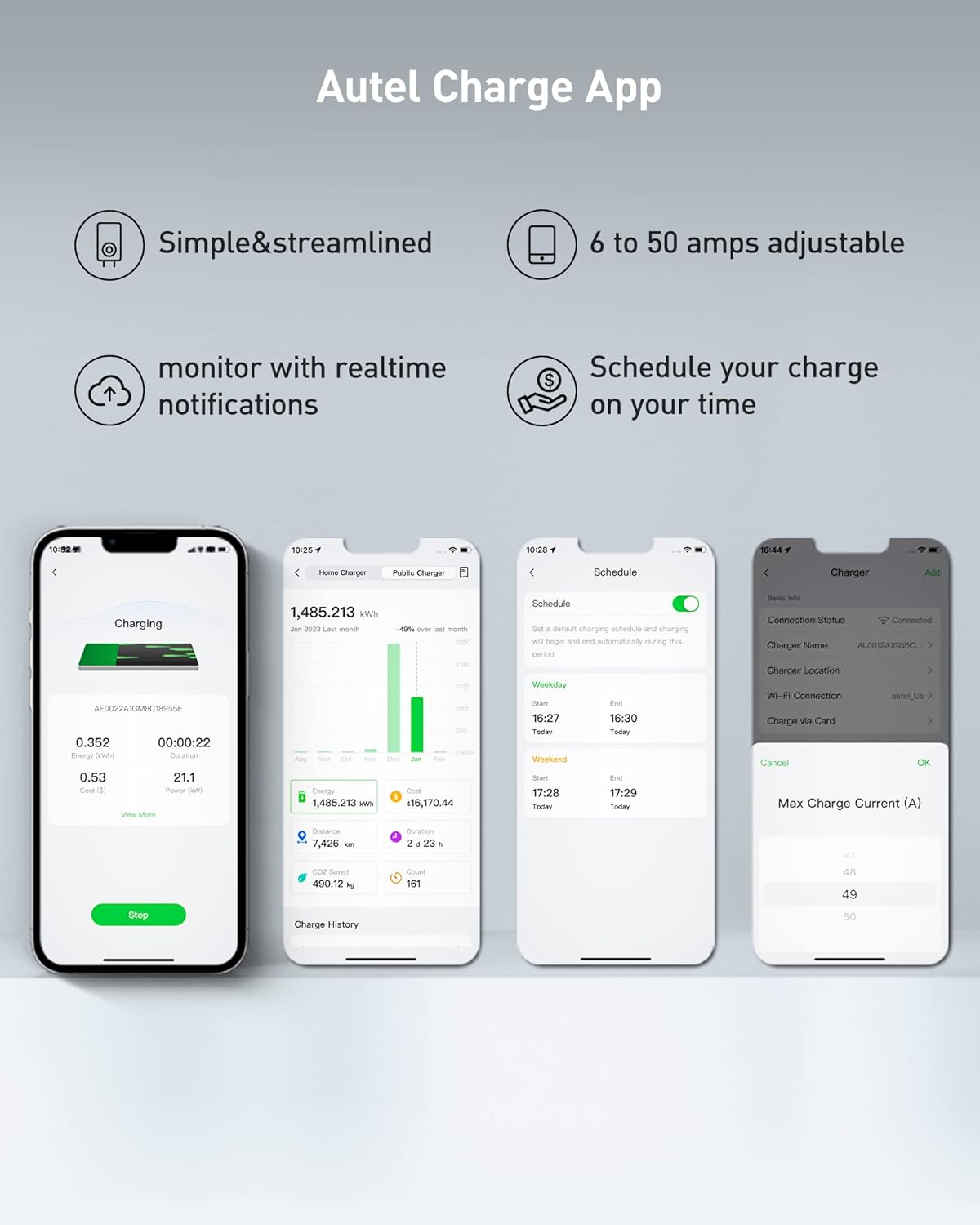 Using the Autel Charge app, you can monitor and manage charging sessions remotely. Schedule charging during off-peak hours, track usage, and customize settings for a more efficient and cost-effective charging experience.