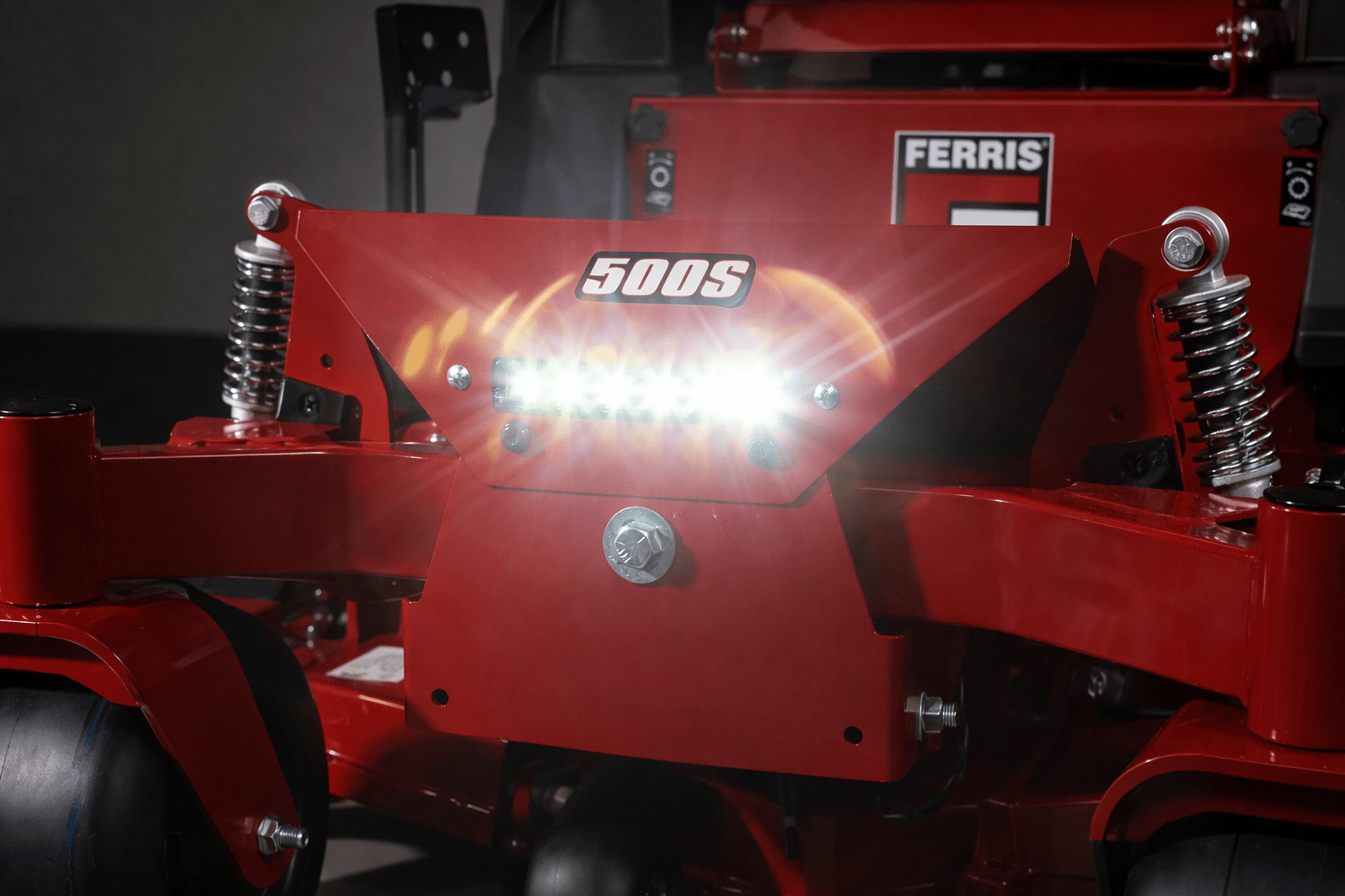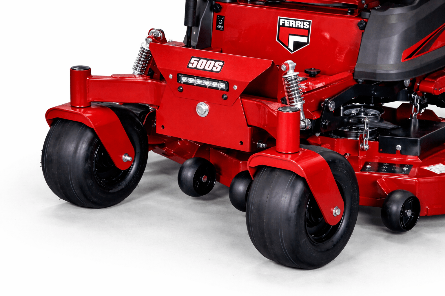The Ferris 500S is equipped with a four-point suspension setup featuring rear swingarm suspension and front coil-over shocks. This design helps absorb bumps and uneven terrain, giving the operator a smoother ride and reducing fatigue during longer mowing jobs.