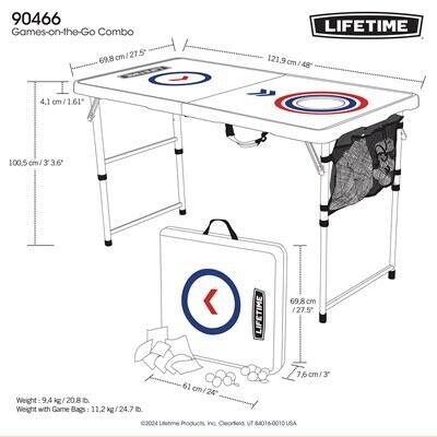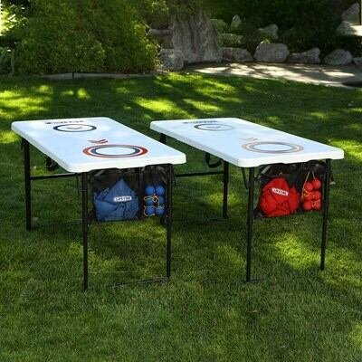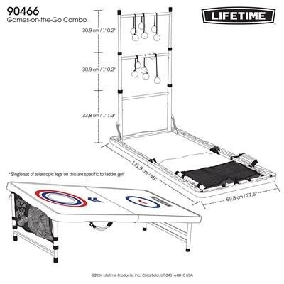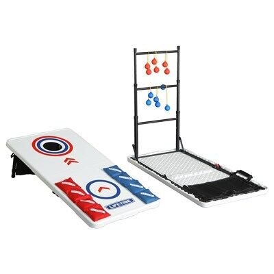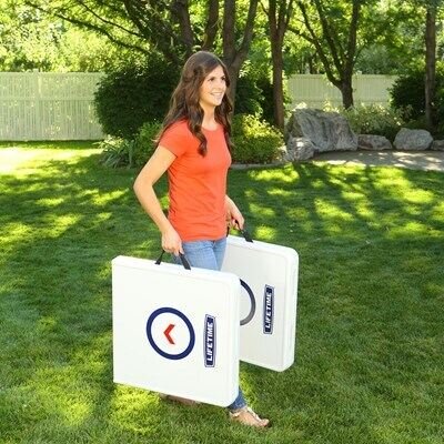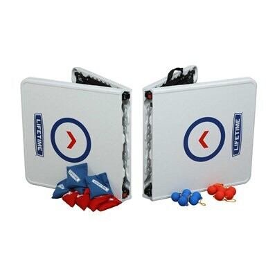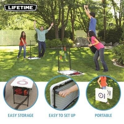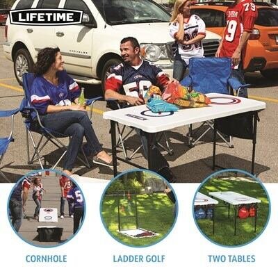 You can enjoy a variety of fun games and activities anywhere you want with the Lifetime Games-on-the-Go combo. This set has all the equipment for a full game of cornhole or ladder toss, and can be set up as two tables for other games, crafts, snacks, tailgating and more! The UV-protected high-density polyethylene tabletops will not fade, crack, or split, and are made to withstand the elements, so they can be used indoors or out. The fold-in-half portable design of the combo makes it perfect for easy transport and storage, and can be set up with no hassle anywhere. The set is made with all-weather materials that will last for years of family fun. With the Lifetime Games-on-the-Go combo, you and your friends and family can have endless fun any time, any place!