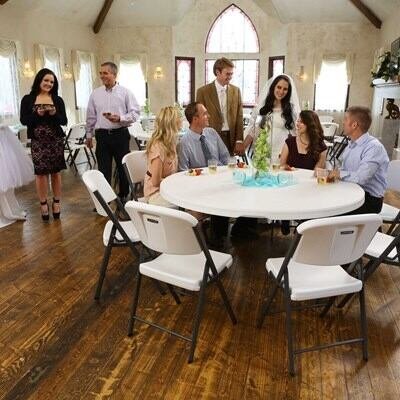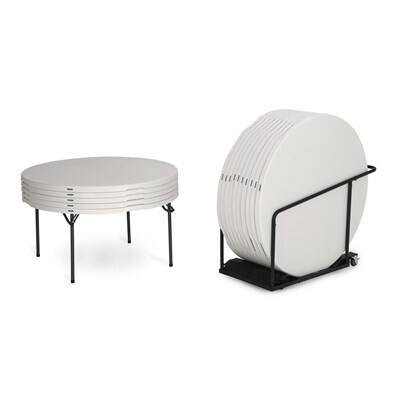 Lifetime combo sets match table and chair models that are known to pair well together. Lifetime 60-Inch Round Commercial Folding Tables are constructed of high-density polyethylene and are stronger, lighter and more durable than wood. The innovative nesting design with HSLA High-Strength Steel lets multiple tables stack together for space saving storage. They will not crack, chip or peel, and are built for indoor and outdoor use. The patented steel frame design provides a sturdy foundation and is protected with a powder-coated, weather-resistant finish. Perfect for banquets, meetings or events, Lifetime 60-Inch Round Folding Tables are built for the rigors of demanding commercial use and exceed challenging BIFMA standards. The Lifetime Table Cart is the perfect addition to your next large event. This new cart design has a lower profile for easy loading or unloading of tables, and the handle unitizes the sides for frame rigidity. The caster wheels are non-marking with convenient foot brakes. It holds up to 11 Lifetime rectangle or 10 round folding tables. The frame is constructed of durable, weather-resistant, powder-coated steel.