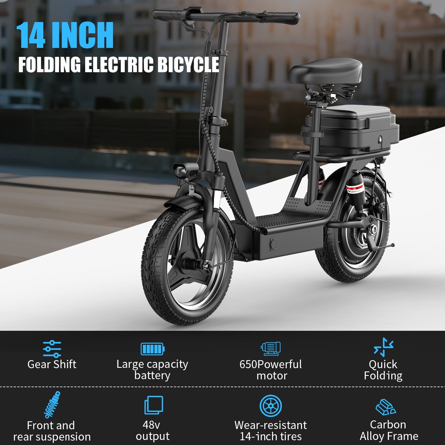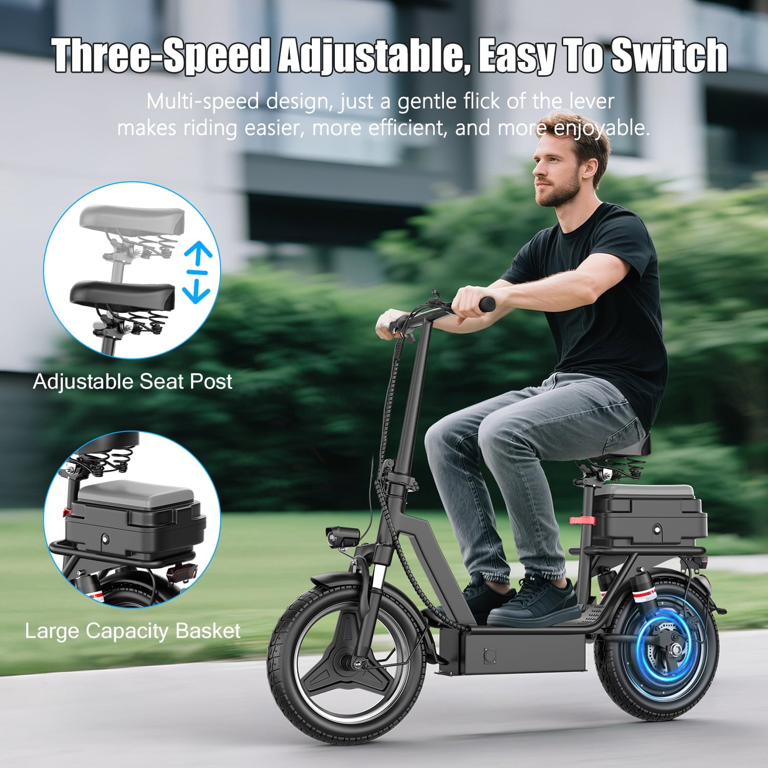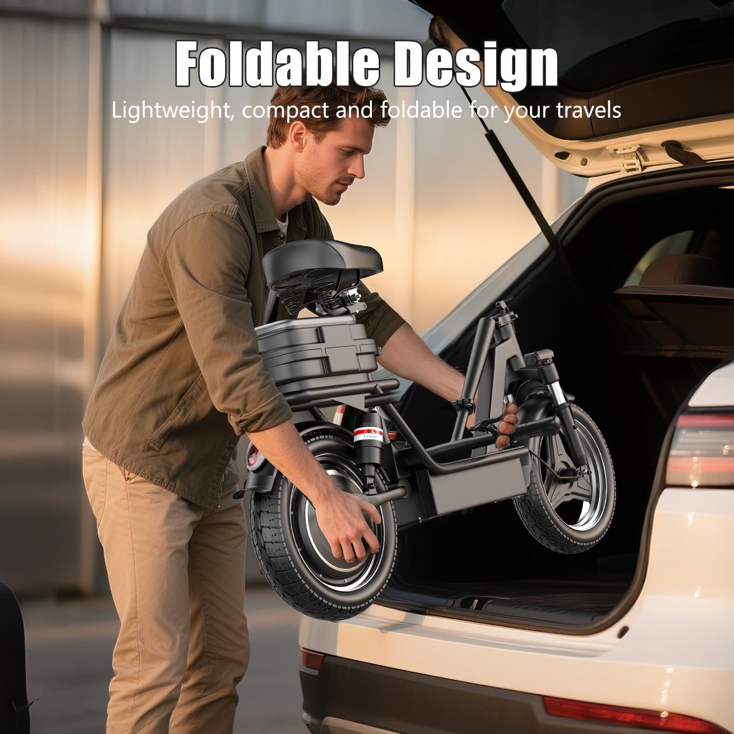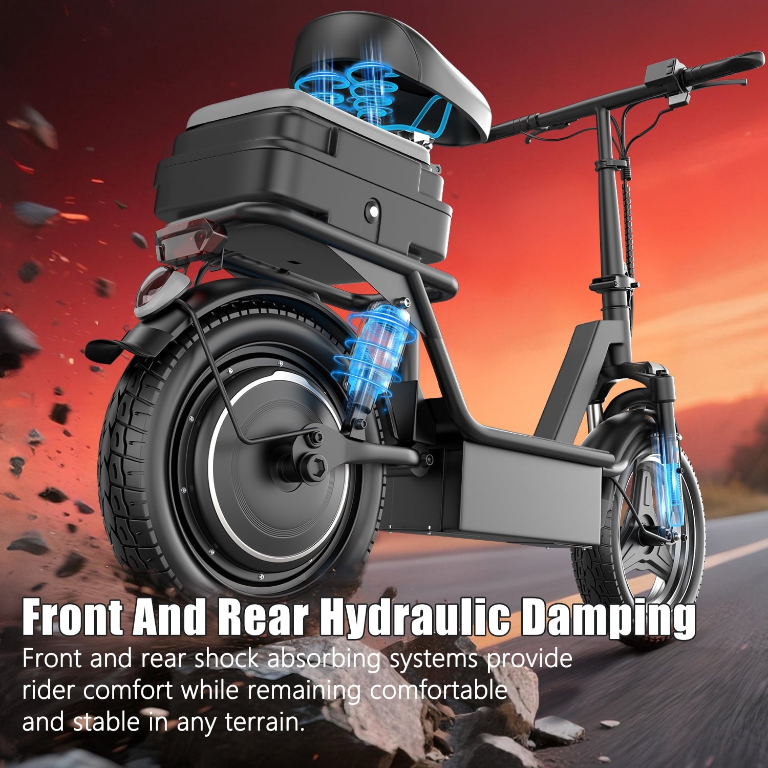 Comfort is enhanced with a built-in seat and large 14-inch puncture-resistant double-layer tires that absorb shocks and handle rough roads with ease. Whether you are commuting to work or cruising through the city, this scooter offers a smooth and stable riding experience.