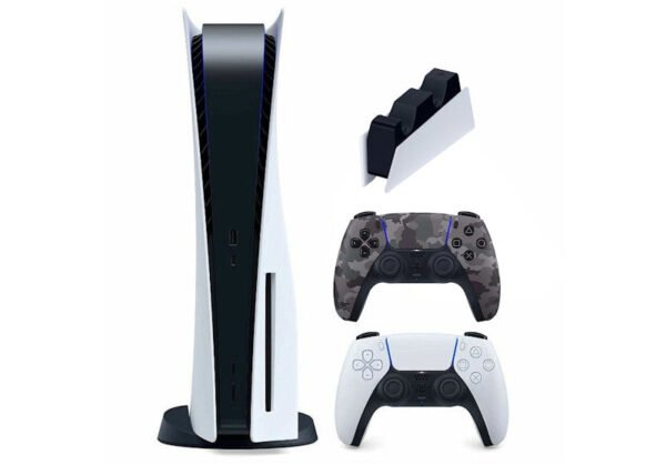Sony PlayStation 5 (PS5) Disc Console Bundle (US Plug) is the ultimate gaming package for next-generation players. This bundle includes the PS5 Disc Console, an extra DualSense Wireless Controller, and a DualSense Charging Station, allowing uninterrupted multiplayer gaming and convenient controller charging.