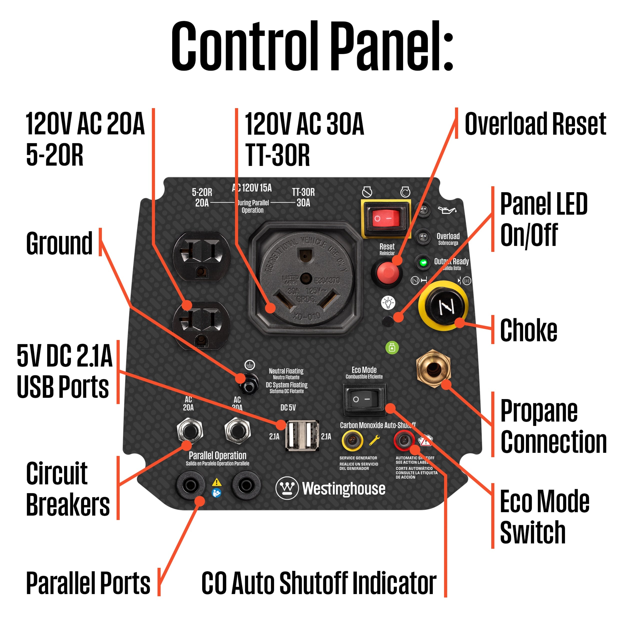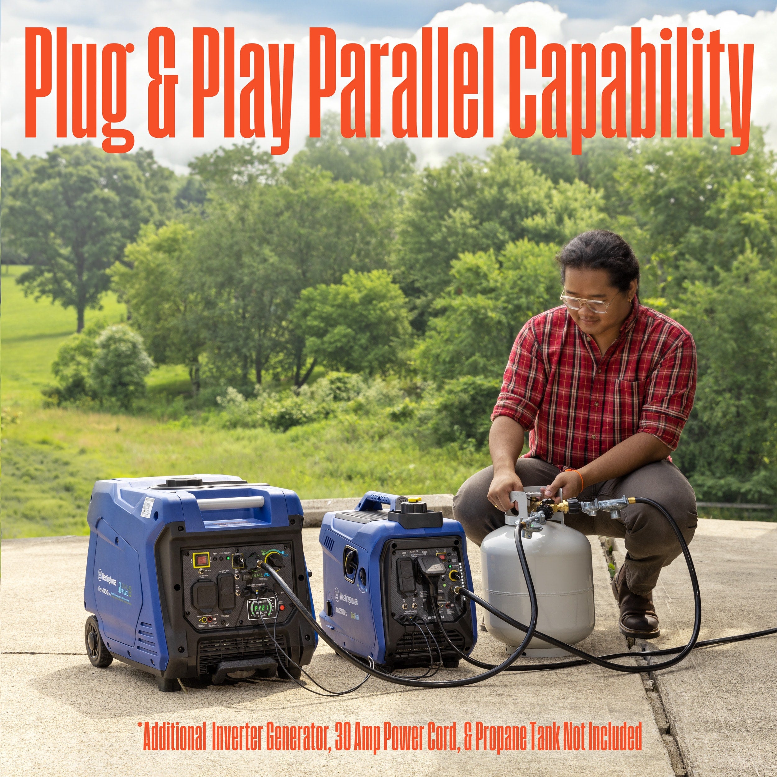 The Westinghouse iGen2550DFc Dual Fuel Portable Inverter Generator produces 2,550 peak watts and 1,900 running watts, making it perfect as an emergency backup for home use or for recreational use. As a dual fuel generator, the iGen2550DFc operates on gasoline or propane for versatility wherever you are. It’s equipped with an RV Ready TT-30R 30A outlet that conveniently hooks to your travel trailer, keeping the air conditioner and travel necessities up and running all day long. The iGen2550DFc can simultaneously power most refrigerators and large appliances as well as any home necessities you may need while traveling. Powered by a 4-Stroke OHV Westinghouse engine, the iGen2550DFc is engineered to automatically adjust its engine speed to produce only the amount of power needed for enhanced fuel efficiency. It’s lightweight and convenient, weighing 42 lbs. with a built-in carrying handle for easy portability. The iGen2550DFc has an ultra-low tone for community-friendly use, operating as low as 52 dBA which is quieter than the average conversation. Unlike traditional generators, the iGen2550DFc safely powers sensitive electronics like plasma/LCD televisions, laptops, tablets, and mobile devices by producing clean, stable power at less than 3% THD. If you need more power, the iGen2550DFc is parallel capable and can be paired with another Westinghouse Inverter Generator using the included parallel cables. The iGen2550DFc features automatic low oil and carbon monoxide (CO) shutdown, voltage regulation, and overload protection, complete with a 3-Year Limited Warranty and Lifetime Technical Support, backed by our nationwide Westinghouse service network. Perfect for Camping, Tailgating, RV’s, Home Backup, and More Dual Fuel, Up To 18 Hour Run Time at 25% Load 2550/2300 Peak Watts and 1900/1700 Rated Watts (Gas/Propane) Bring power to your home during a power outage or recreational activities Dual fuel – conveniently runs on gasoline or propane (LPG) for versatile operation 2550 peak watts, 1900 running watts and runs for up to 12 hours on a 1.11 gallon gas tank Enhanced fuel efficiency – variable engine speeds allow 30% to 50% higher fuel efficiency than a traditional generator Lightweight and compact design – the iGen2550DFc weighs 42.4 pounds and features a built-in carry handle for easy transportation CA Residents: Prop 65 Warning(s) Prop65 Warning Label PDF