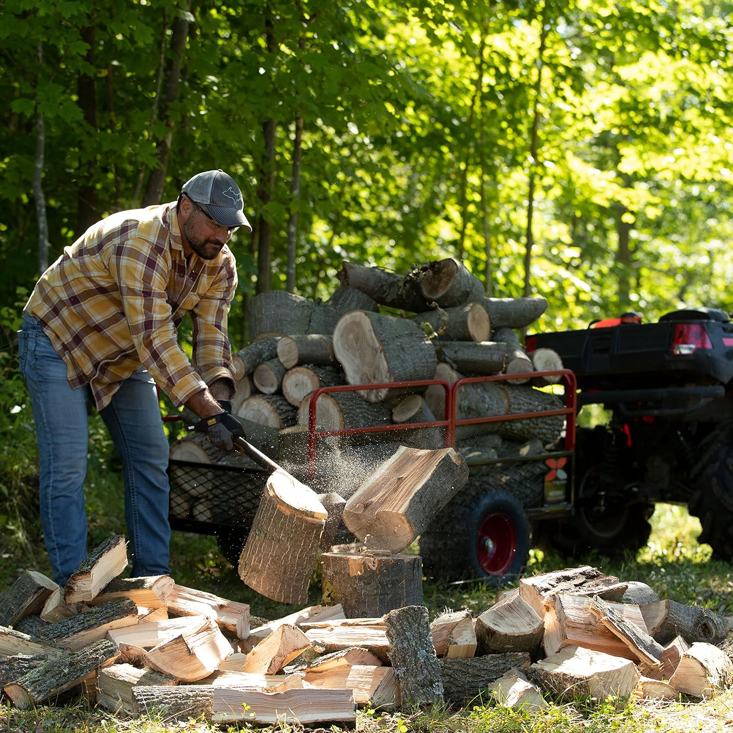 - Pivoting and tilting bed for easier loading and unloading. Pass-through axle eliminates the chance that brush will get caught to keep you moving down the trail smoothly. Large knobby flotation tires help absorb shock and provide additional traction and stability.